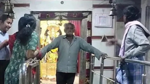 सोशल मीडिया पर सामने आए वीडियो में एक आदमी घुटने के बल बैठा हुआ दिख रहा है, जो मंदिर में अंदर जाने के रास्ते को रोक रहा है। वह आदमी नए विवाहित जोड़े पर चिल्लाता है और उनसे बाहर निकलने के लिए कहता है।