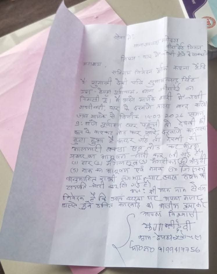 प्राप्त जानकारी के अनुसार, ग्राम निवासी सुगंती देवी अपने घर में ताला लगाकर अपने मायके गई हुई थीं। दिनांक 14 मार्च 2026 की सुबह करीब 9:00 बजे जब वह वापस अपने घर पहुंचीं, तो घर के अंदर का नजारा देखकर दंग रह गईं। घर का सारा सामान बिखरा पड़ा था और छत के दरवाजे का ताला टूटा हुआ था। आशंका जताई जा रही है कि चोर छत के रास्ते घर में घुसे और वारदात को अंजाम दिया। चोरों ने घर में रखे कीमती गहनों और नगदी समेत करीब चार लाख रुपये की संपत्ति चोरी कर ली और मौके से फरार हो गए। घटना के बाद पीड़िता ने सिवान जिले के जीरादेई थाना में लिखित आवेदन देकर न्याय की गुहार लगाई।