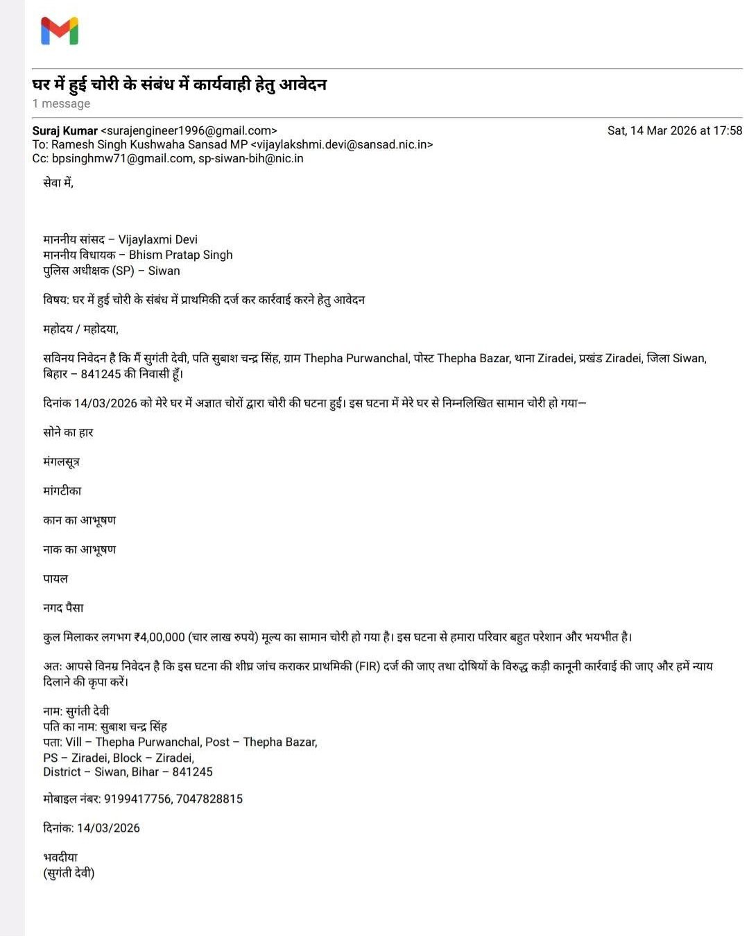 हैरानी की बात यह है कि, घटना के कई दिन बीत जाने के बावजूद पुलिस ने अब तक इस मामले में FIR तक दर्ज नहीं की है। इससे न सिर्फ पीड़िता परेशान है, बल्कि स्थानीय लोगों में भी पुलिस के प्रति आक्रोश बढ़ता जा रहा है। पीड़िता के घर वालों ने मामले की जानकारी ईमेल के माध्यम से पुलिस अधीक्षक सिवान को भी दी है, लेकिन इसके बावजूद कोई ठोस कार्रवाई नहीं हो सकी है। आरोप है कि पुलिस न तो चोरों का सुराग लगाने में सक्रिय दिख रही है और न ही मामले को गंभीरता से ले रही है।